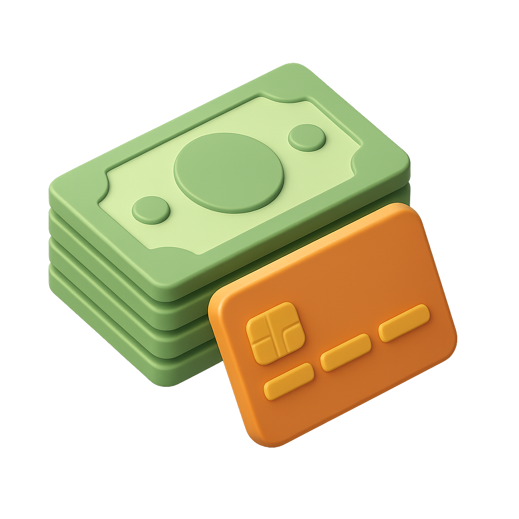 /Collection: /by davooda/Type: PNG/A stylized 3D representation of stacked banknotes and a credit card, set against a soft gradient background. The banknotes are green, while the credit card features an orange hue, designed to convey a modern financial theme.