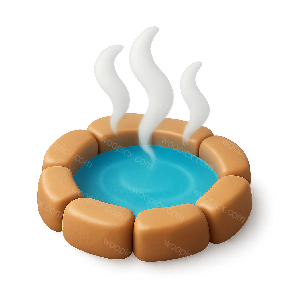 A visually striking 3D icon of a steaming hot spring, featuring a circular stone border and vibrant blue water. The steam rises gracefully, enhancing the tranquil atmosphere.