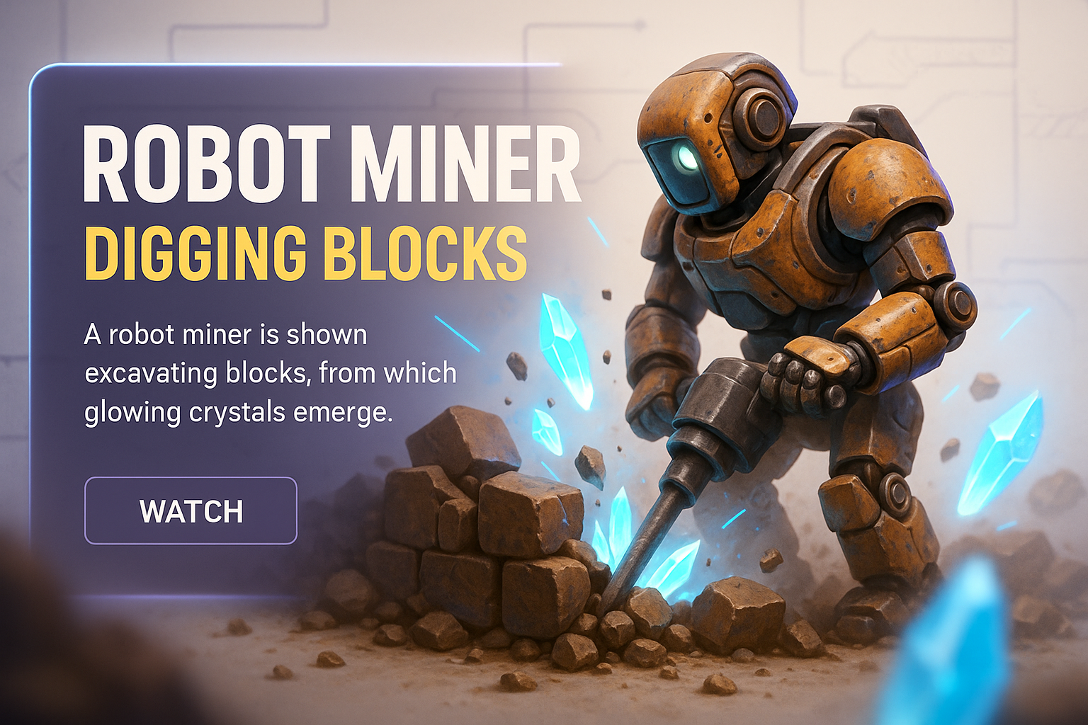 Vibrant 3D illustration depicting a robot miner excavating blocks with glowing crystals emerging, ideal for gaming or tech-related content.