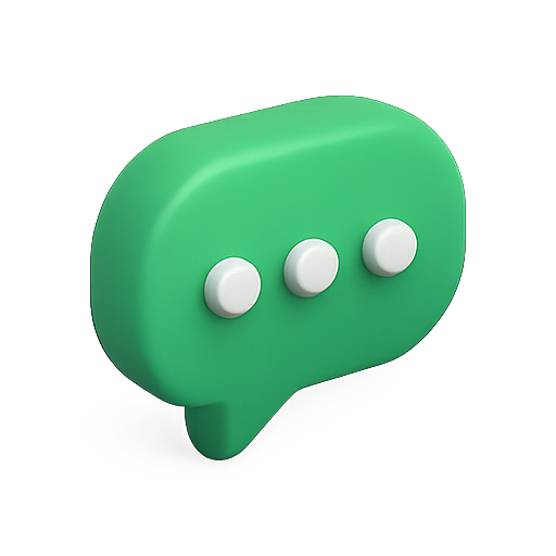 A modern 3D styled green chat bubble icon featuring three white dots, symbolizing conversation. Ideal for messaging apps, websites, and digital communication.