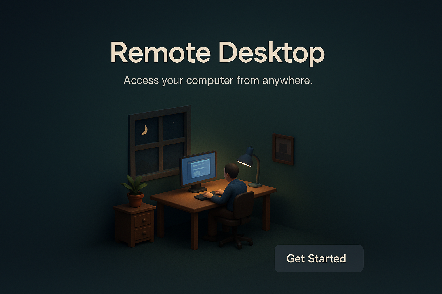 A detailed 3D scene depicting a remote desktop setup at night. A figure sits at a desk with a computer, illuminated by a desk lamp, creating a cozy atmosphere.