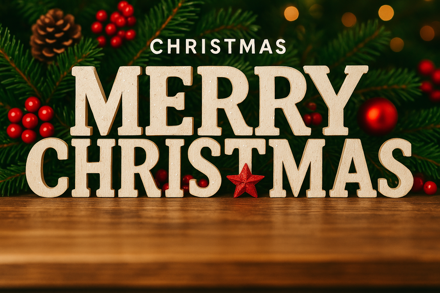 /Collection: /by davooda/Type: PNG/Charming holiday-themed image featuring the phrase 'Merry Christmas' in decorative lettering, set against a backdrop of evergreen branches and festive ornaments, ideal for seasonal greetings.