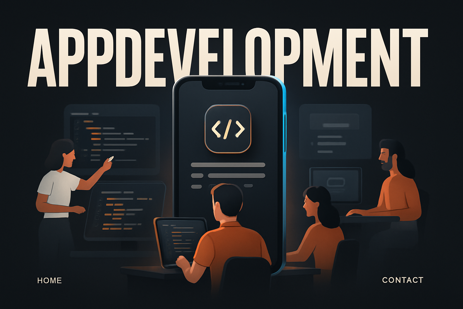 /Collection: /by davooda/Type: PNG/A vibrant scene of developers engaged in mobile app development, showcasing coding for iOS and Android. The dark background enhances the dramatic, modern aesthetic.