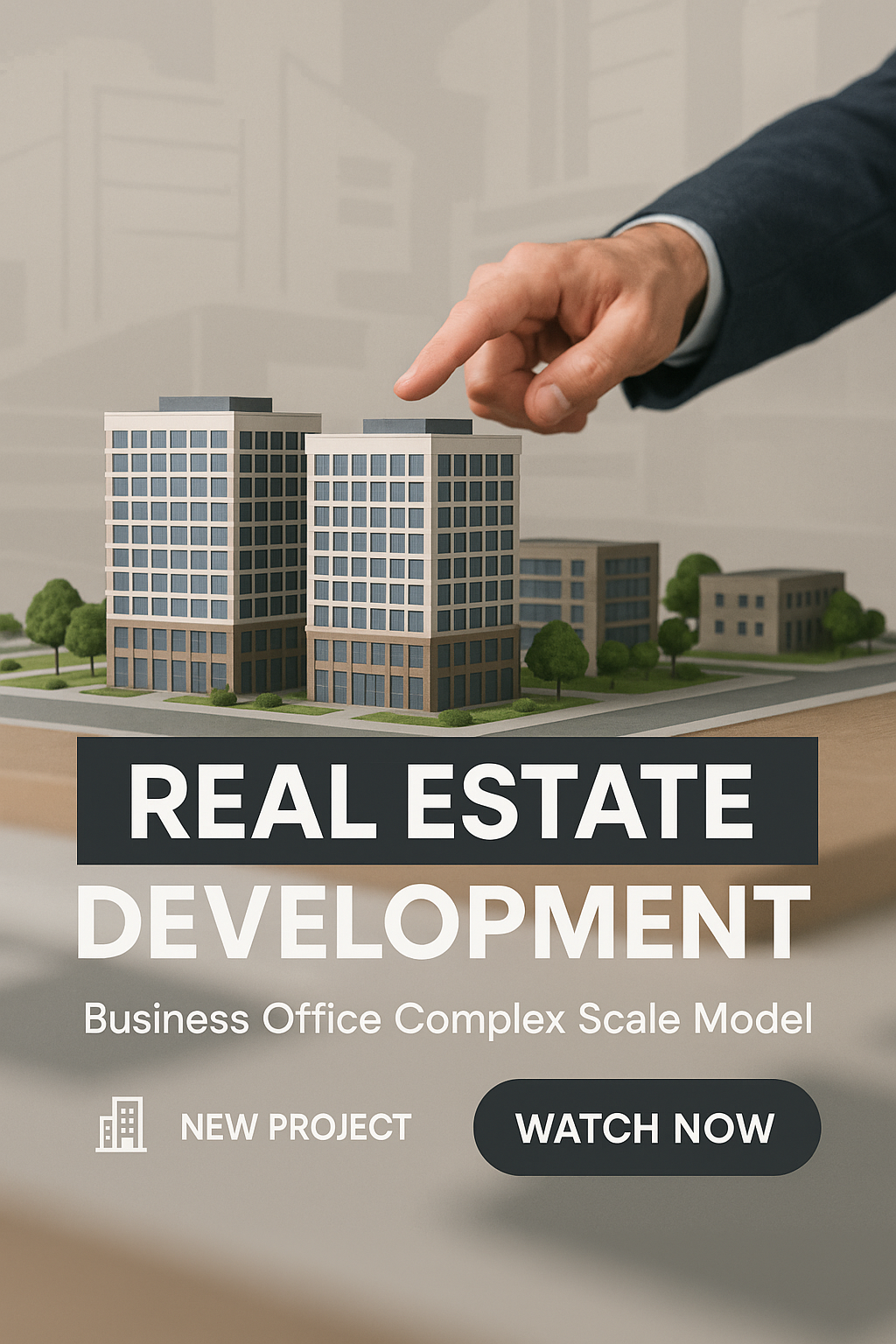 Engaging promotional graphic showcasing a scale model of a business office complex, ideal for real estate marketing and project presentations.
