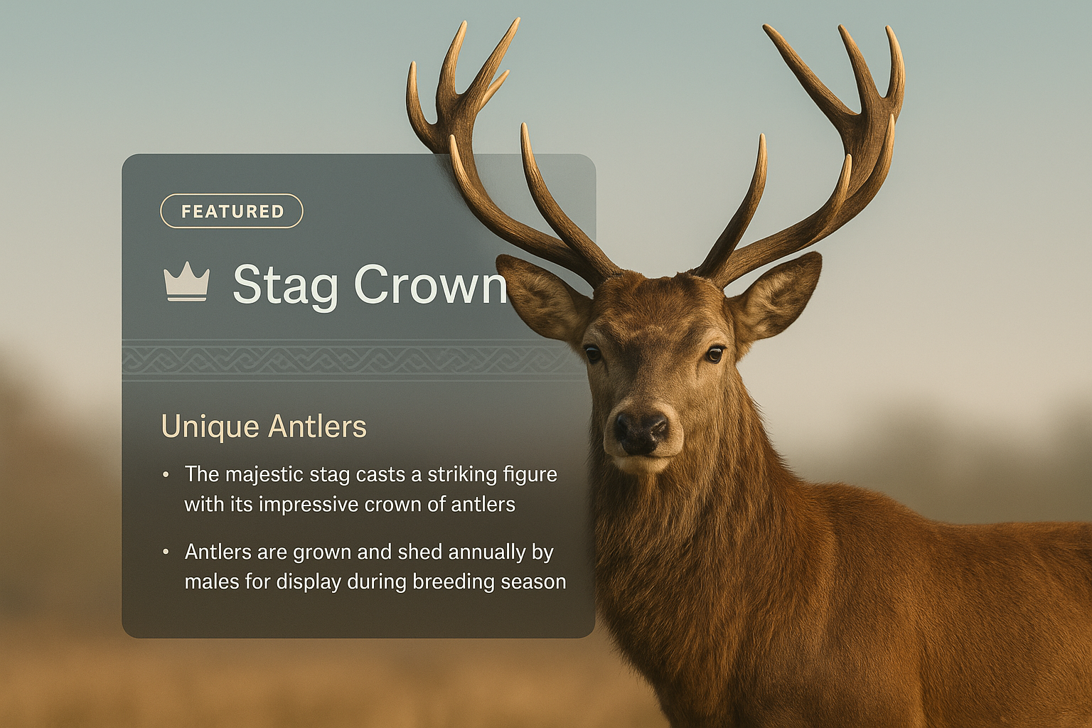 A stunning illustration of a stag with impressive antlers, featuring a translucent overlay with information about its unique characteristics. The design blends nature and informative elements seamlessly.