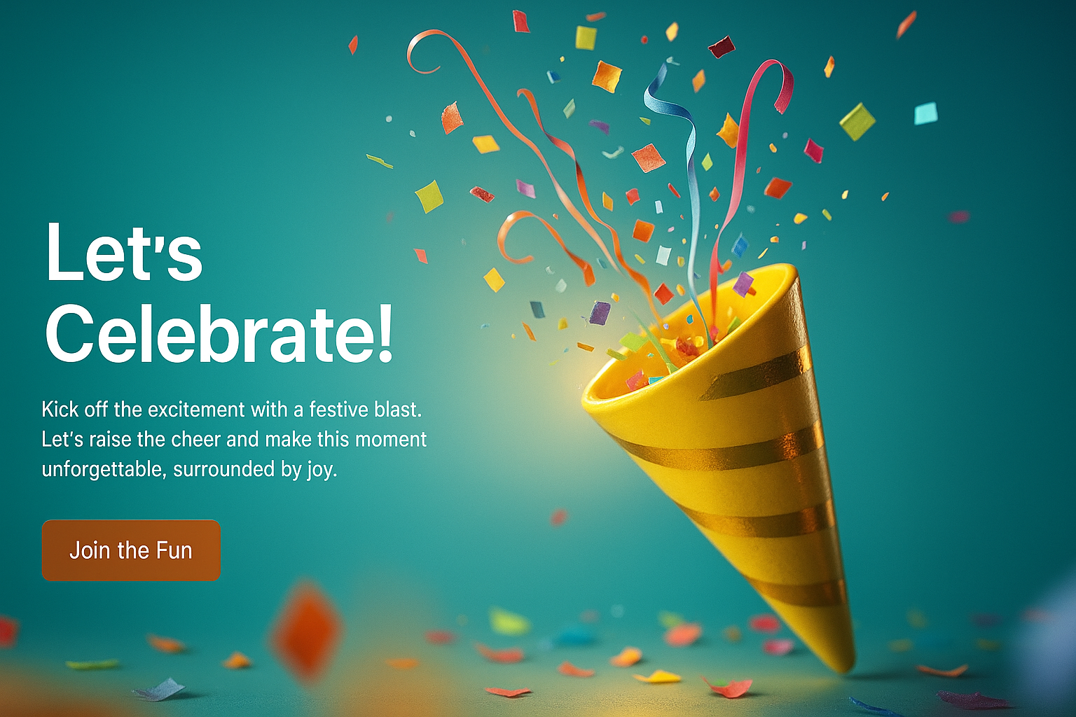 /Collection: /by davooda/Type: PNG/A vibrant 3D rendering of a yellow party popper bursting with colorful confetti. The background features a bright, solid color, enhancing the festive atmosphere. Text elements invite celebration.