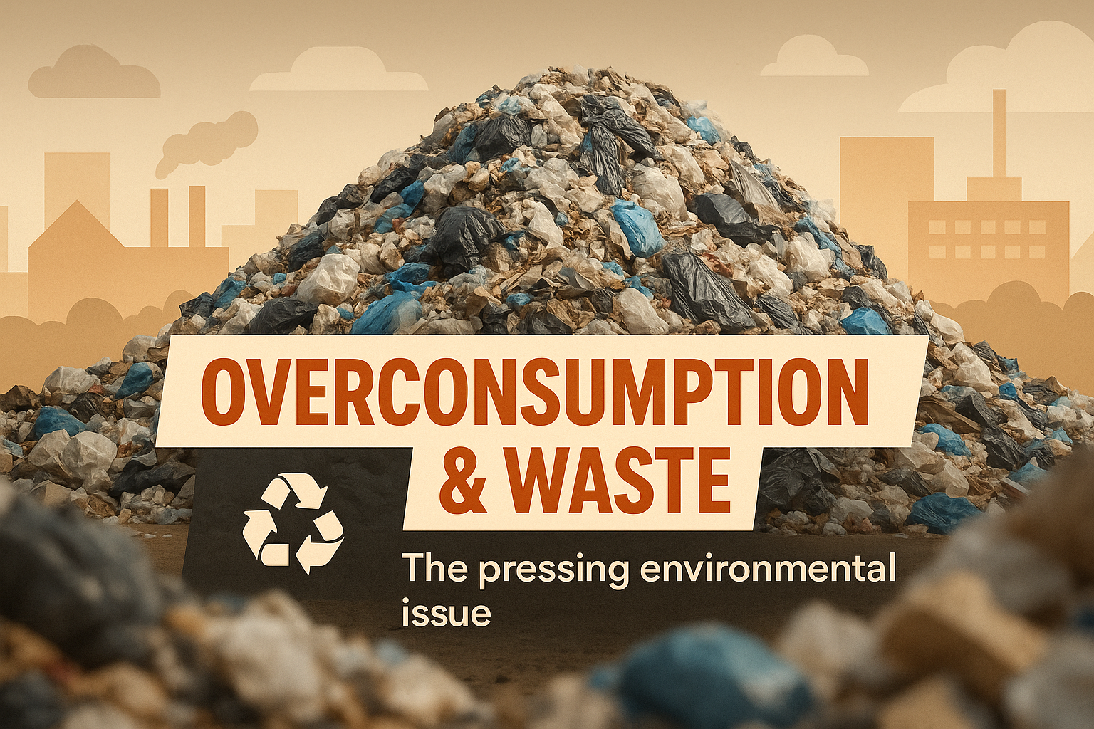 /Collection: /by davooda/Type: PNG/Informative graphic highlighting the issues of overconsumption and waste, featuring a striking visual of a garbage heap with a recycling symbol. Ideal for environmental campaigns.