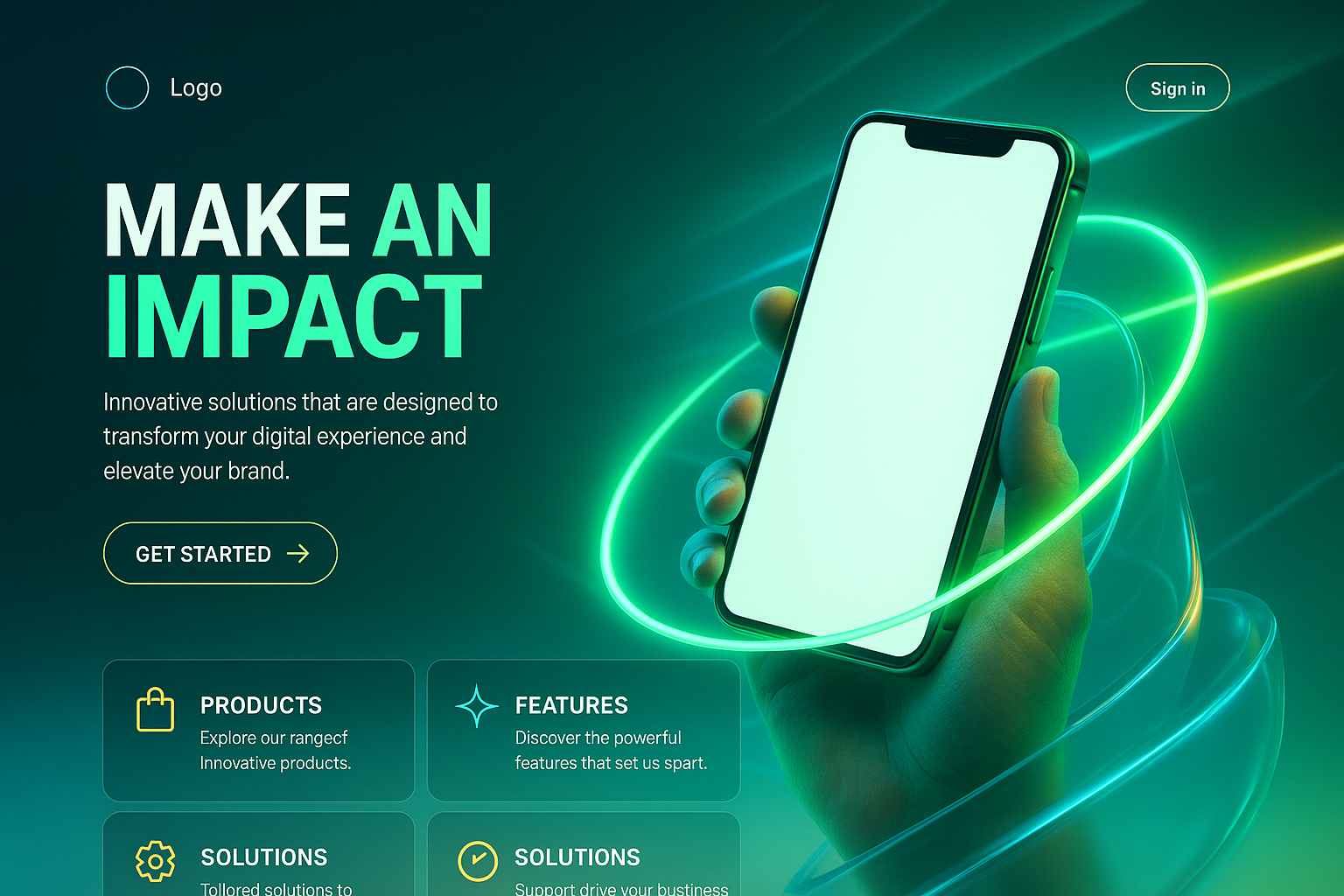 /Collection: /by davooda/Type: PNG/A vibrant neon-themed landing page featuring a smartphone in a hand with glowing accents. The design includes sections for products, features, and solutions, emphasizing modern aesthetics.