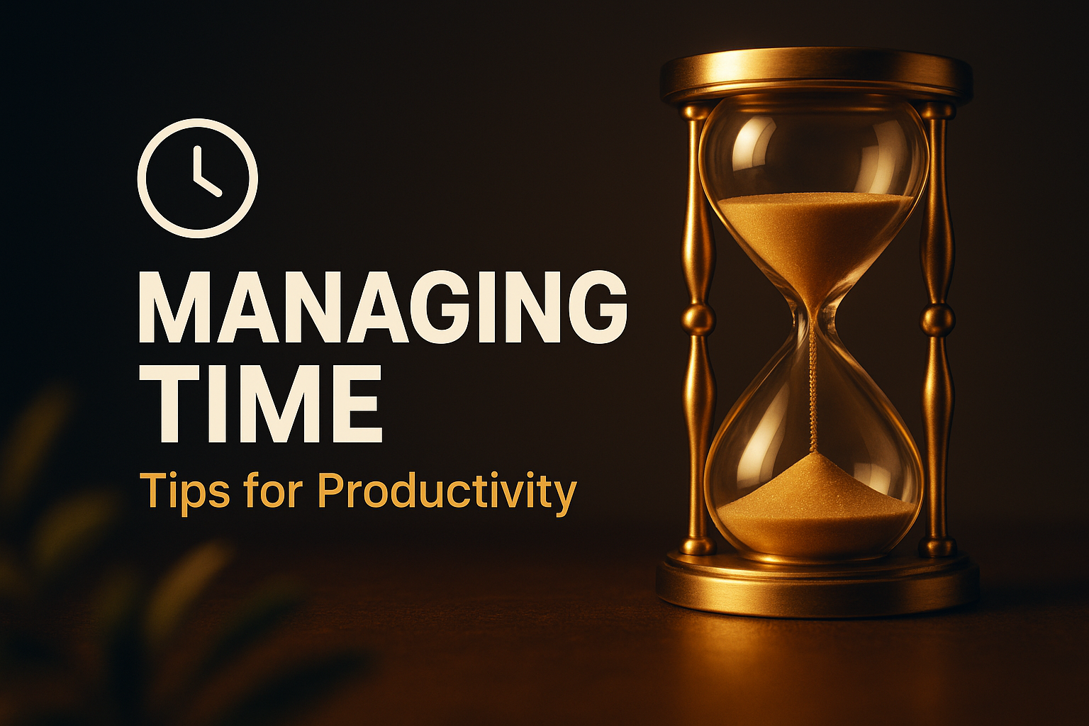 Stylish graphic focusing on time management, featuring an hourglass and text elements. Ideal for productivity-related content in blogs or social media.