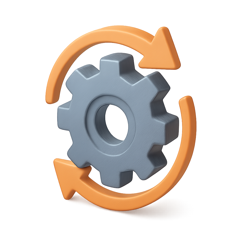 /Collection: /by davooda/Type: PNG/A stylized 3D gear icon featuring circular arrows surrounding it, presented in a three-quarter view with a volumetric appearance. The gear is gray, while the arrows are orange, set against a soft gradient background.