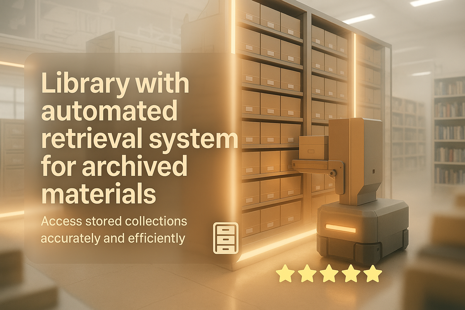 /Collection: /by davooda/Type: PNG/A conceptual image depicting a modern library featuring an automated retrieval system for archived materials, highlighting technological advancements in information access. Ideal for tech-focused presentations or articles.