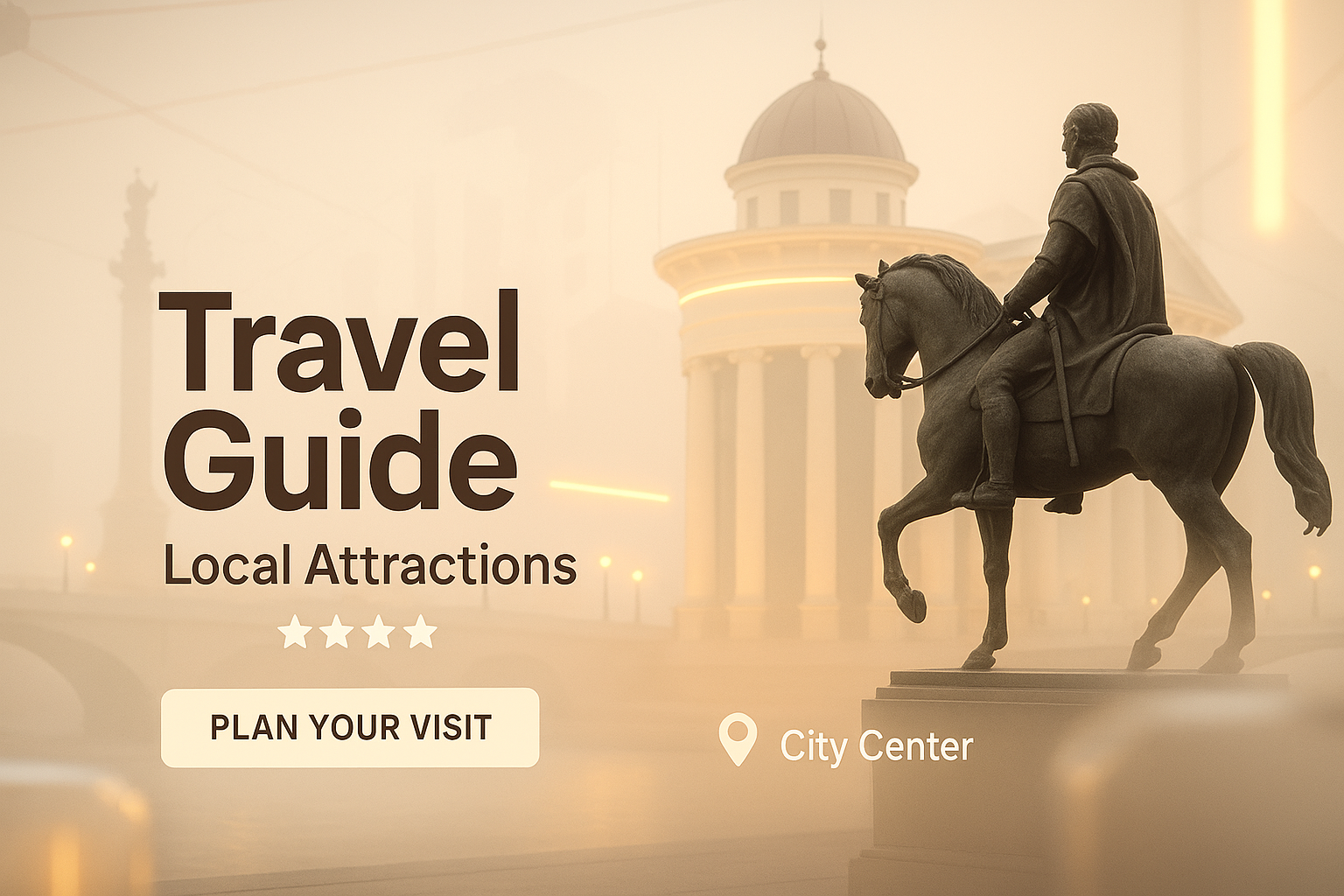 /Collection: /by davooda/Type: PNG/Promotional travel guide banner showcasing local attractions with a focus on a statue in a foggy city center. Ideal for tourism marketing and travel websites.
