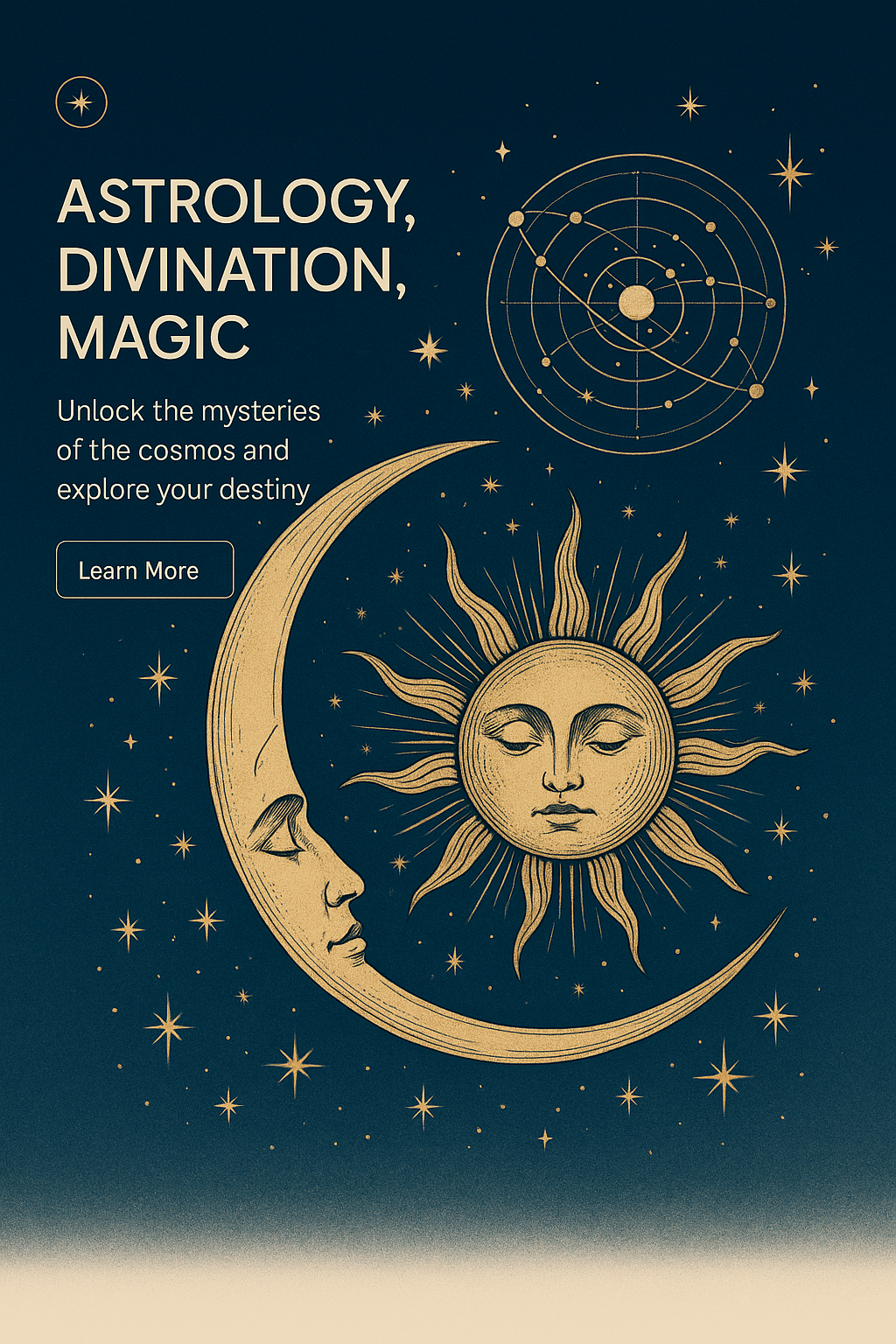 A stylish banner featuring a crescent moon and sun with faces, set against a deep blue background. It incorporates cosmic elements and a call-to-action button for exploring astrology.