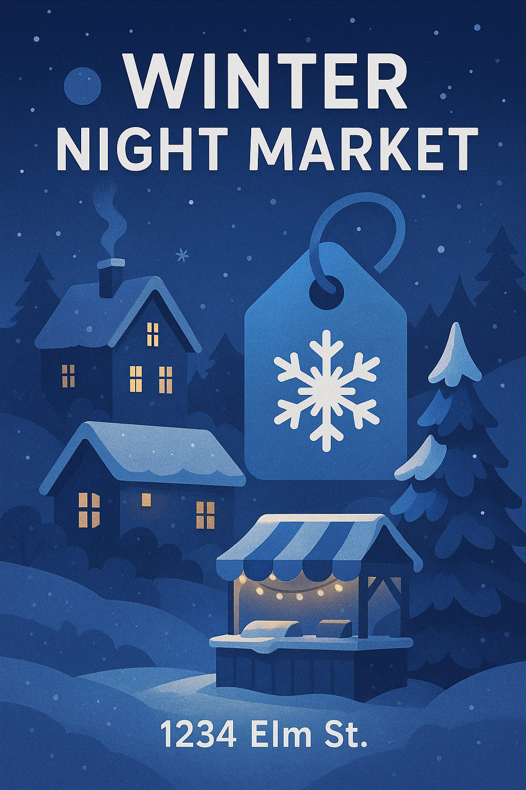 /Collection: /by davooda/Type: PNG/Charming promotional graphic featuring a winter night market scene, showcasing a cozy stall and snowy landscape. Ideal for event marketing and seasonal promotions.