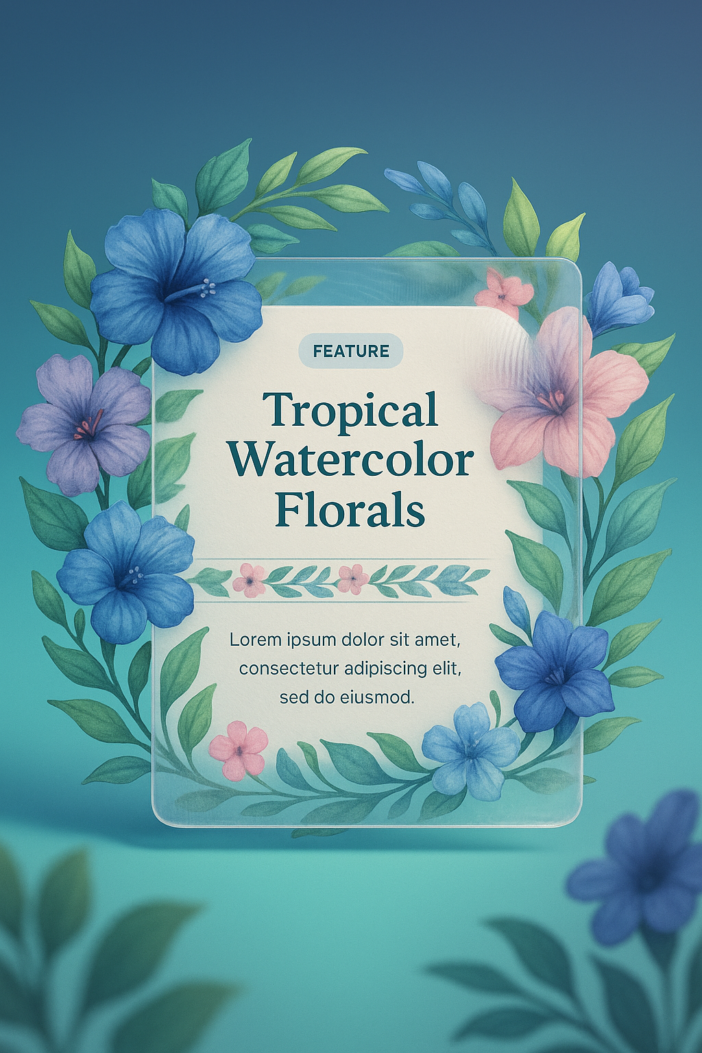 /Collection: /by davooda/Type: PNG/A vibrant tropical watercolor floral arrangement featuring blue and green flowers. The design includes a central feature block with a title and decorative elements, creating a layered visual effect.