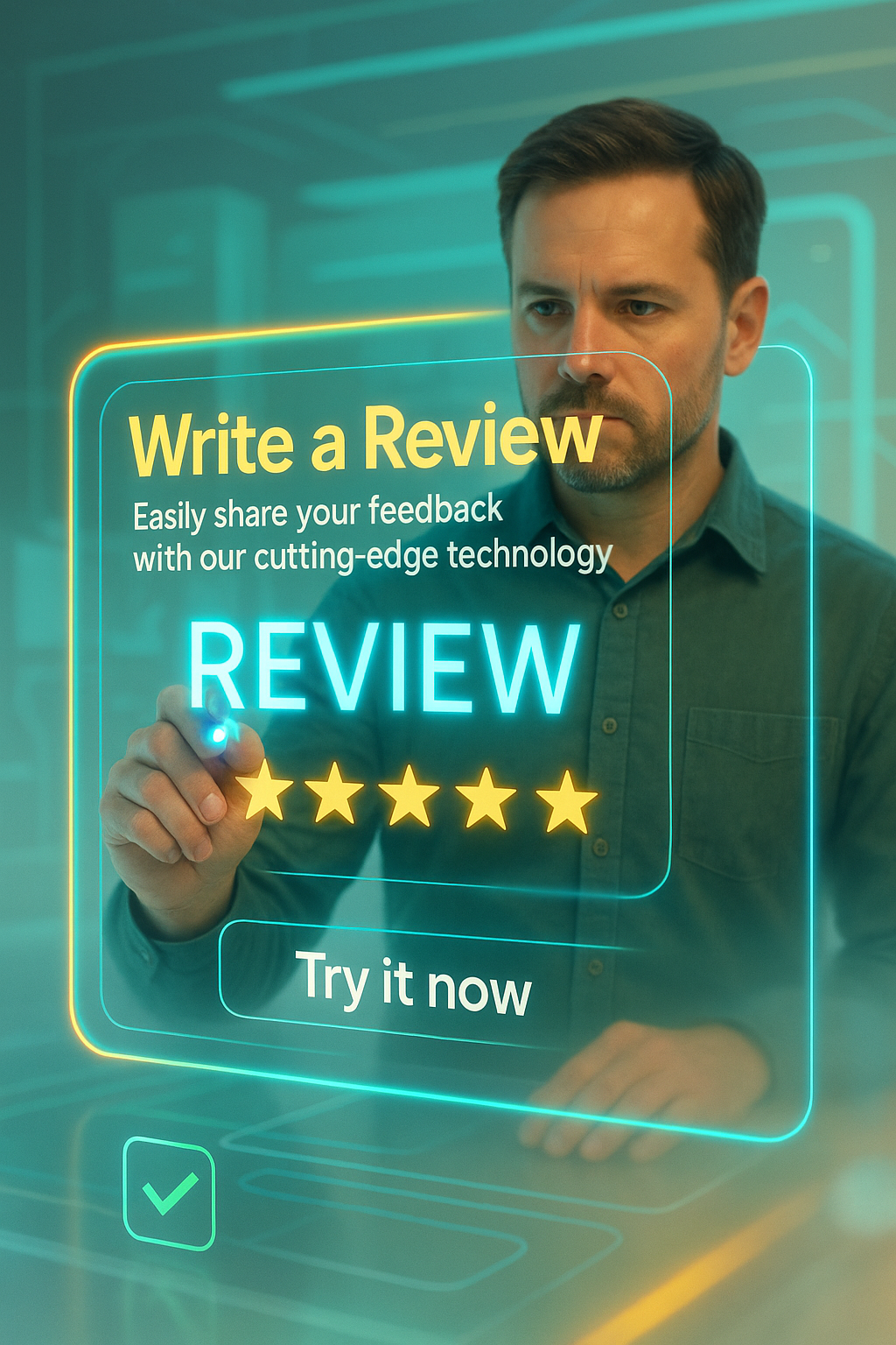 /Collection: /by davooda/Type: PNG/Visually engaging graphic showcasing a user interacting with a futuristic review interface, perfect for promoting user feedback submission in tech applications.