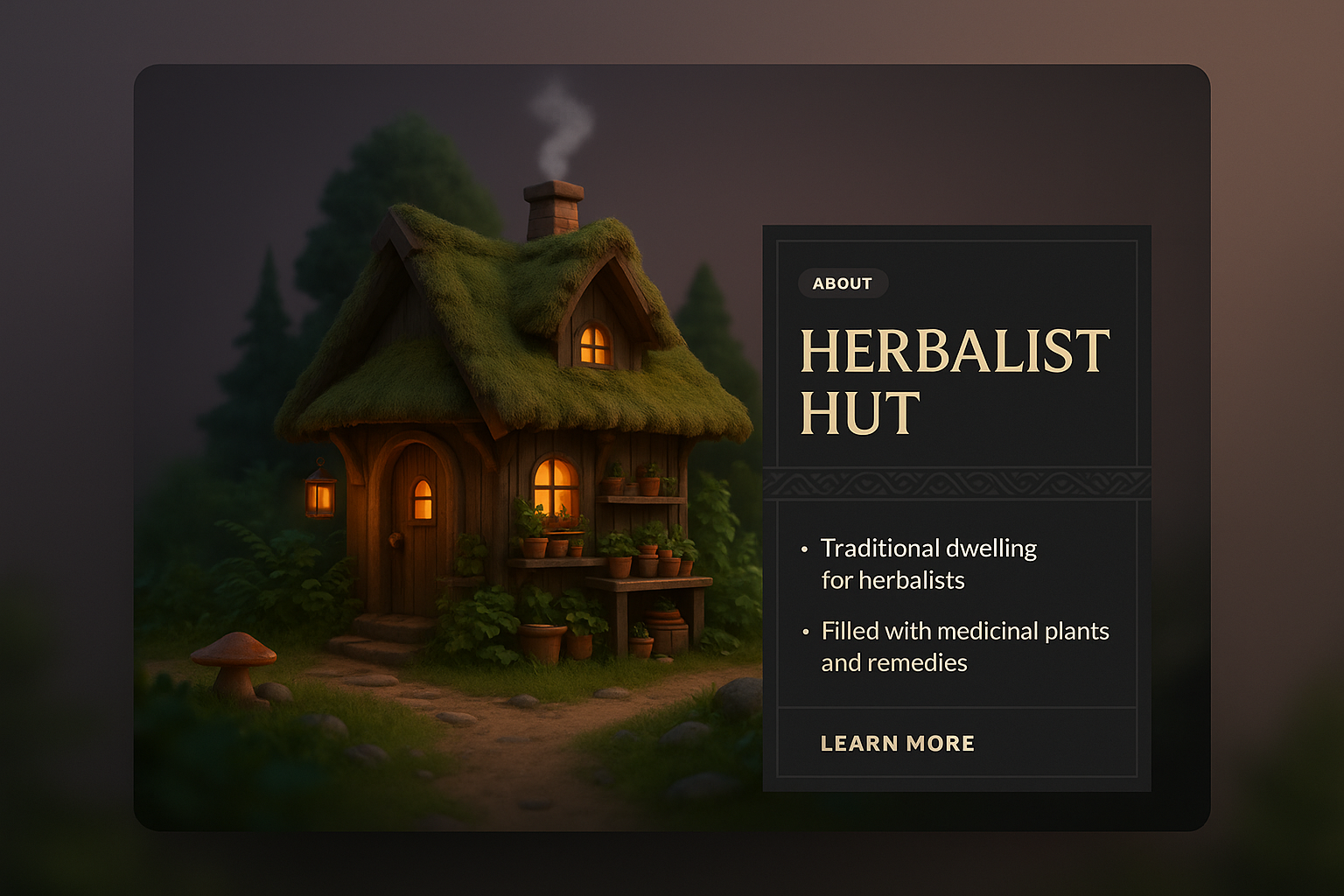 /Collection: /by davooda/Type: PNG/A beautifully illustrated herbalist hut nestled in nature, featuring warm lights and surrounded by greenery. The design includes informative blocks and a cohesive layout.