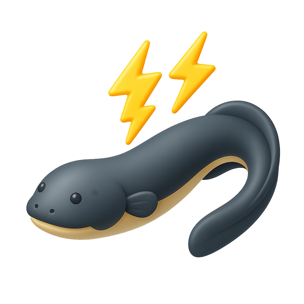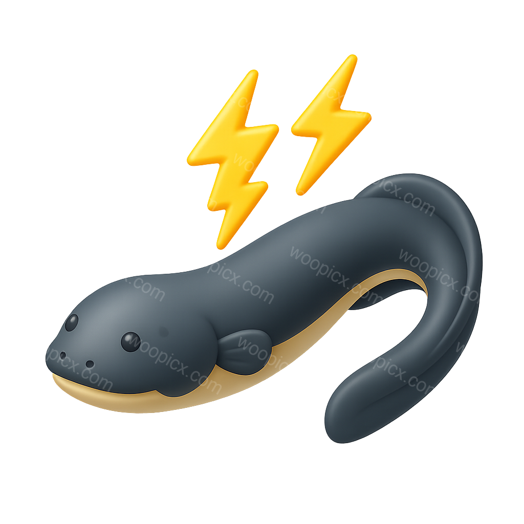 A stylized 3D representation of an electric eel, featuring a sleek design with a subtle glow. Two yellow lightning bolts emanate from the eel, enhancing the electric theme.