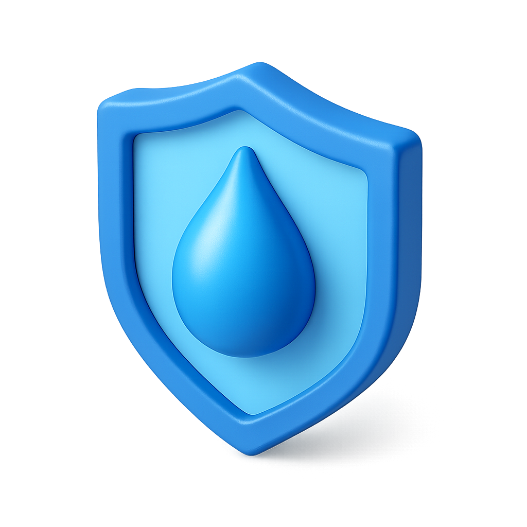A three-dimensional icon featuring a water drop enclosed in a blue shield, rendered in a volumetric style with a transparent background and a three-quarter view.