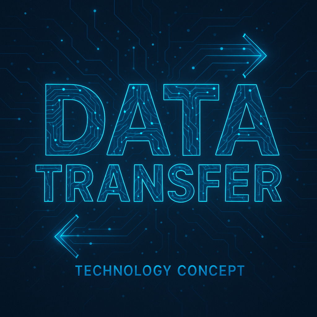 Futuristic graphic design representing data transfer with glowing typography against a dark background, ideal for tech-related content and presentations.
