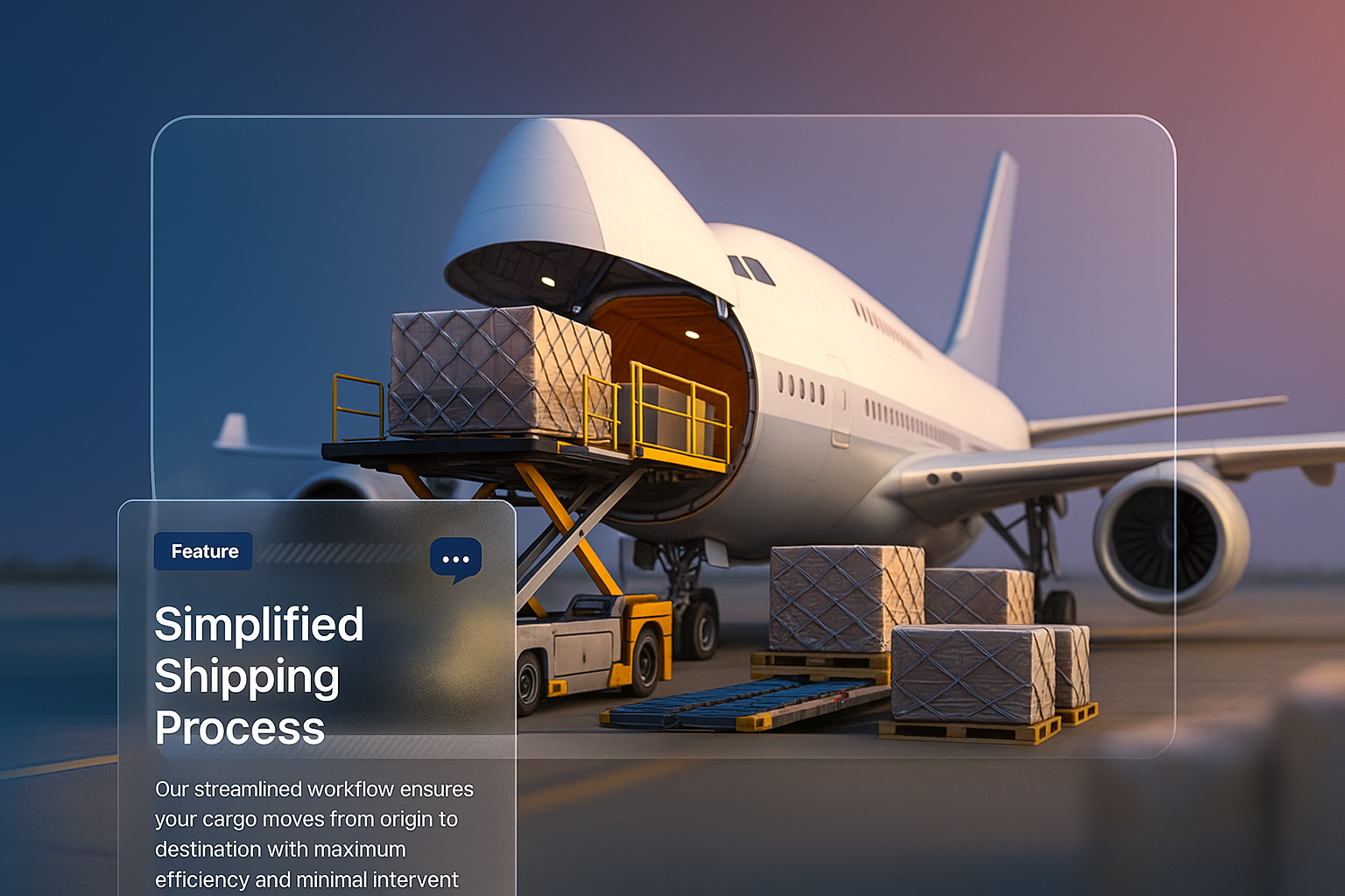 A 3D illustration depicting the loading of goods onto a cargo plane at an airport. The scene features stacked cargo boxes being moved by a forklift, with a gradient background enhancing the visual depth.