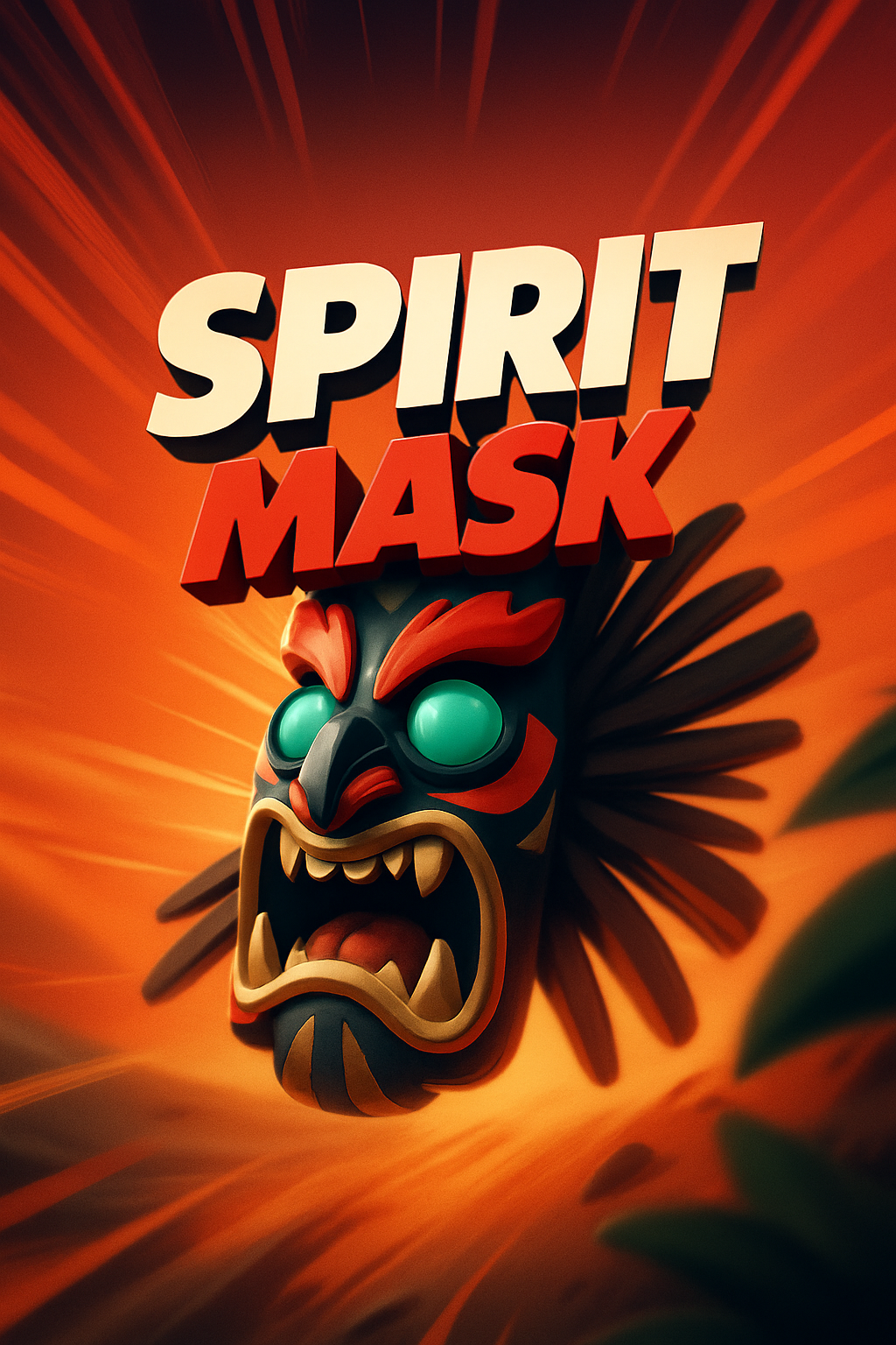 /Collection: /by davooda/Type: PNG/A vibrant and dynamic illustration featuring a spirit mask, with bold typography and energetic lines radiating outward. The background transitions smoothly, enhancing the visual impact.