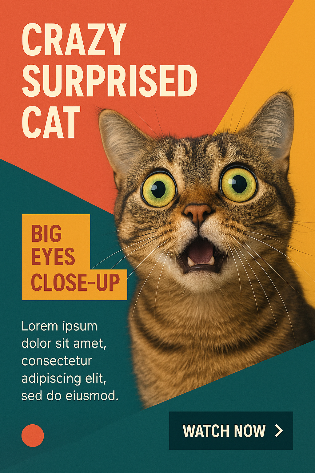 A close-up of a surprised cat with large eyes set against a vibrant, colorful background. The design features a clear hierarchy and engaging elements.