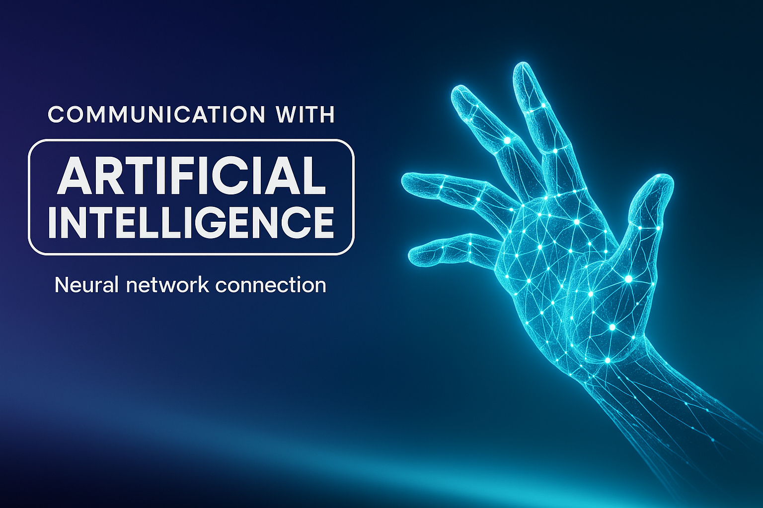 /Collection: /by davooda/Type: PNG/A digital hologram of a hand symbolizes communication with artificial intelligence, set against a dark gradient background. Features neural network connections for a futuristic aesthetic.
