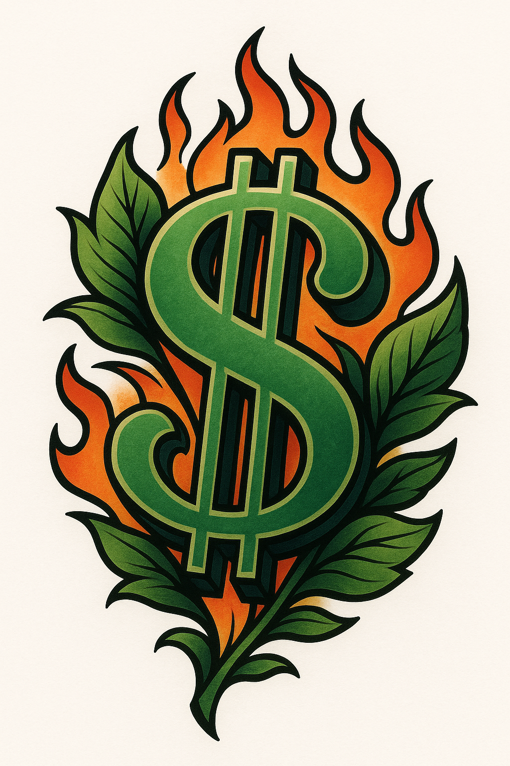 A vibrant illustration featuring a dollar sign surrounded by flames and leaves, ideal for artistic projects focusing on finance or rebellion. The design combines bold colors and a dynamic composition.
