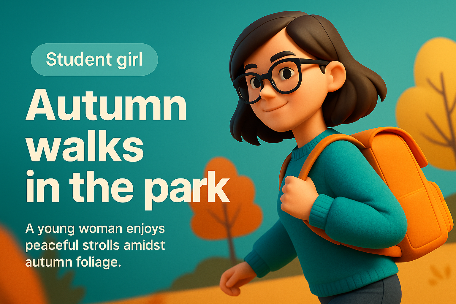 A charming 3D illustration of a student girl with glasses and a backpack strolling through a serene autumn park, surrounded by colorful foliage.