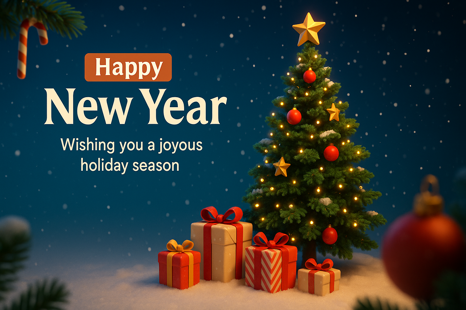 A cheerful holiday-themed graphic featuring a decorated Christmas tree and gift boxes, ideal for New Year celebrations and seasonal greetings.