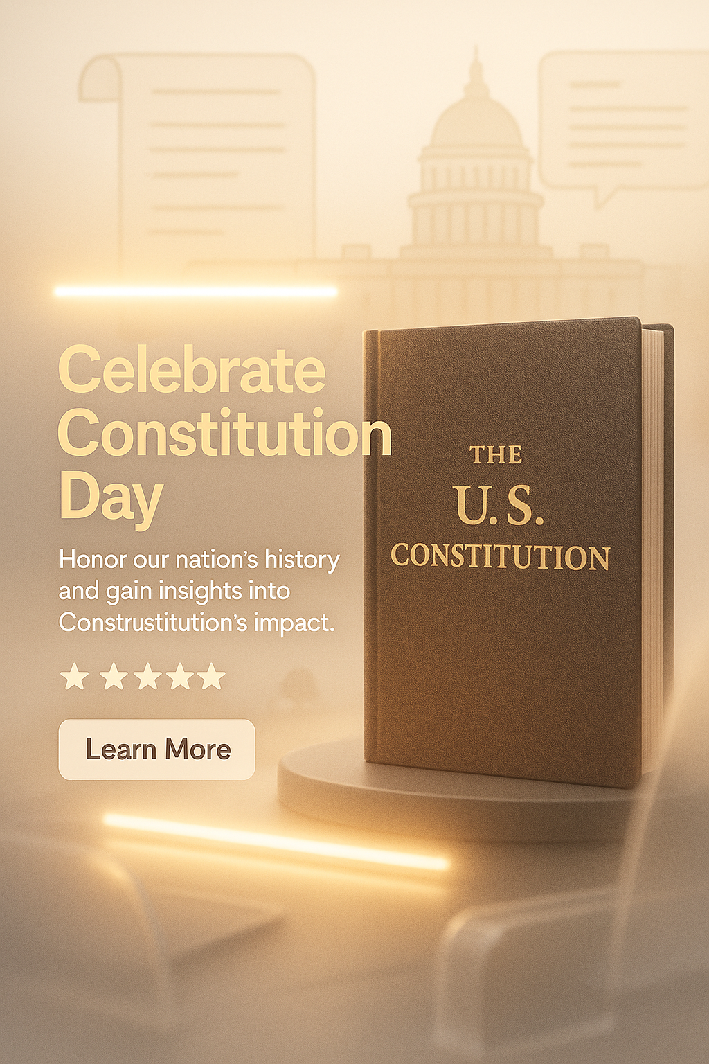 /Collection: /by davooda/Type: PNG/Engaging promotional image celebrating Constitution Day, featuring a stylized book representation of the U.S. Constitution with a modern design, aimed at educating the audience on its historical significance.