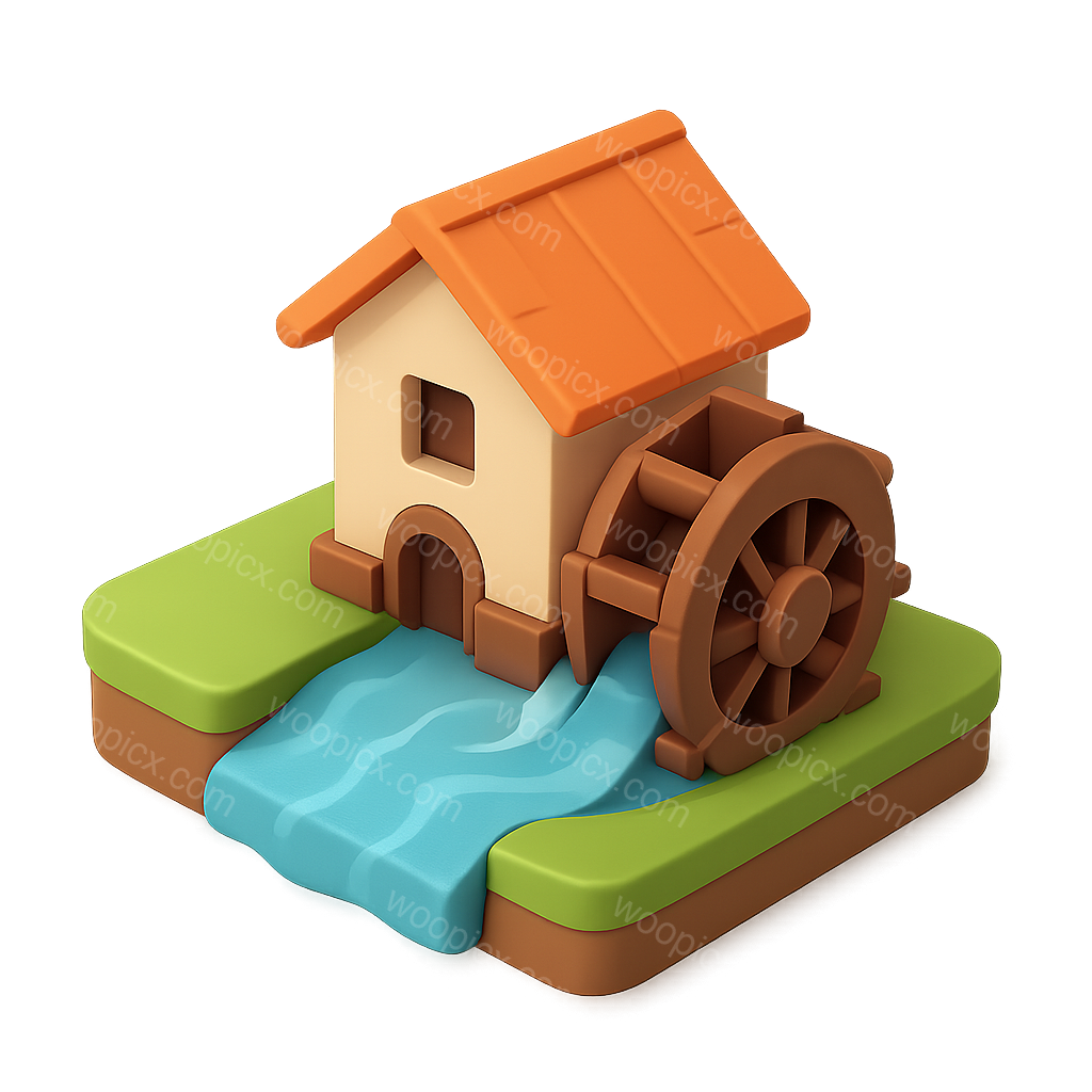 A delightful 3D icon featuring a quaint watermill with a wooden water wheel, set against a flowing river. The scene has a vibrant, isometric design with a transparent background.