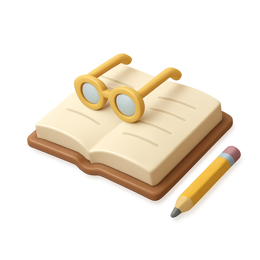 A 3D illustration of an open book with yellow glasses resting on top and a pencil beside it. The design features a transparent background and a volumetric, isometric style.