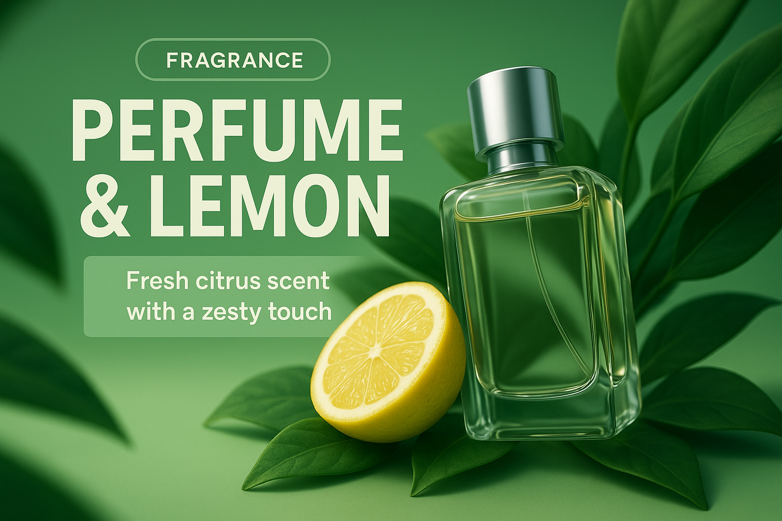 This image features a stylish perfume bottle alongside a lemon, set against a green background. Ideal for fragrance marketing, emphasizing freshness and zest.