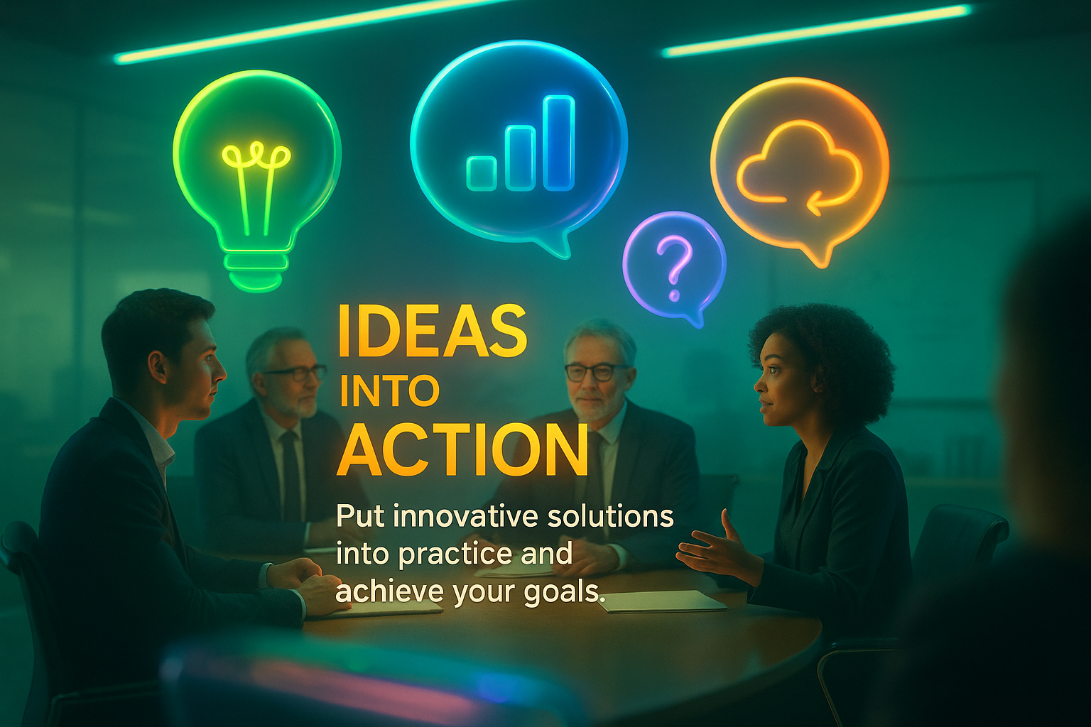 /Collection: /by davooda/Type: PNG/A visually engaging image depicting a business meeting with neon light elements representing ideas and solutions, perfect for corporate presentations or marketing materials.