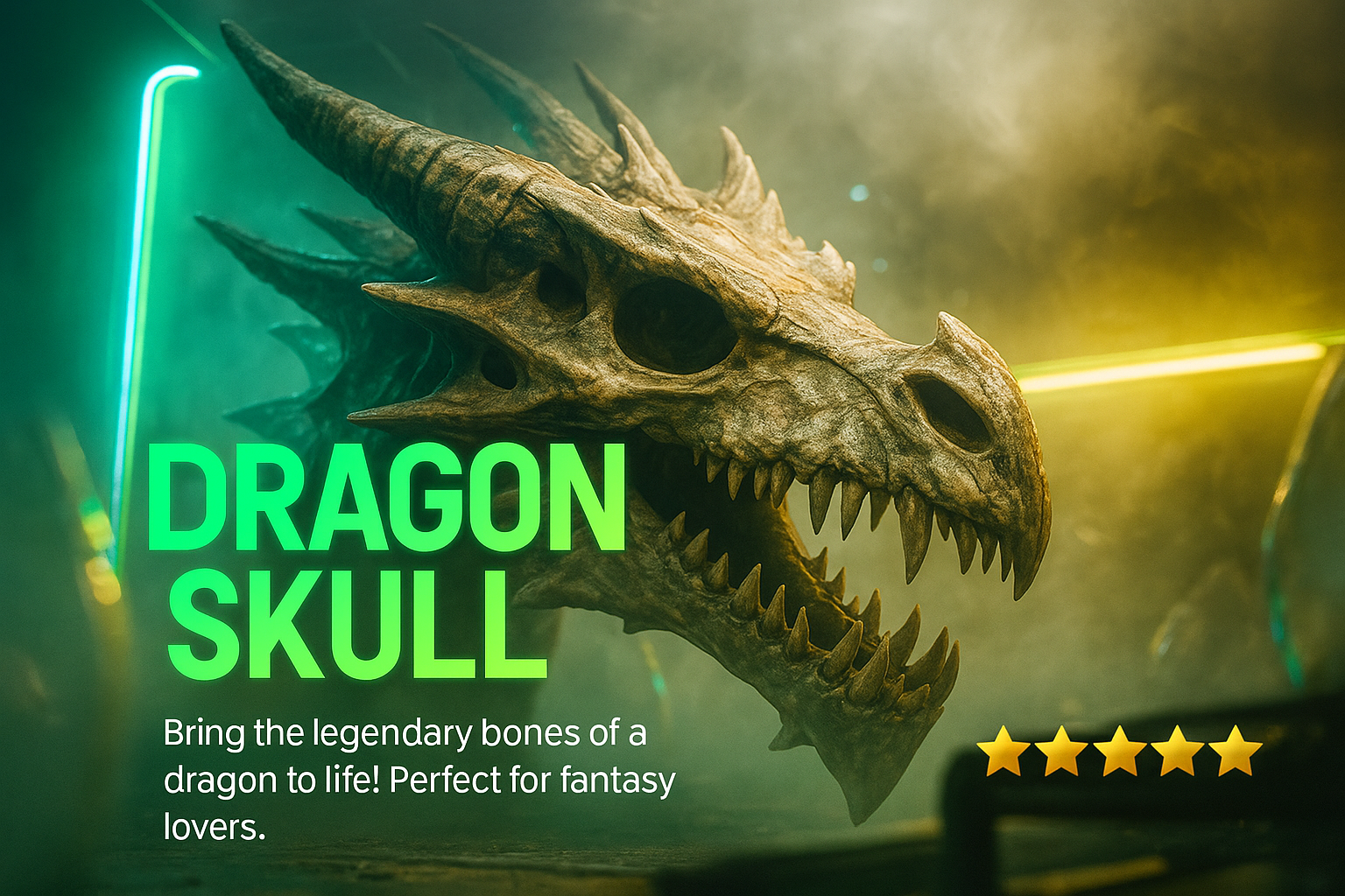 A captivating neon-themed design featuring a dragon skull, illuminated by vibrant neon lights. The layout includes engaging text and glowing accents, perfect for fantasy enthusiasts.