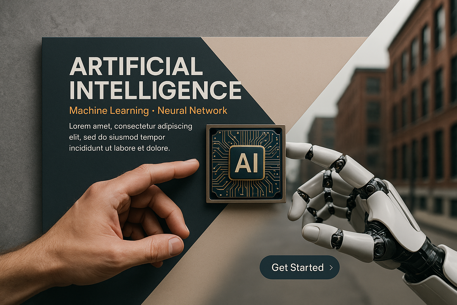 /Collection: /by davooda/Type: PNG/A visually striking web banner featuring a human hand and an android robot hand reaching towards an AI chip. The backdrop includes an urban setting, emphasizing technology and machine learning.