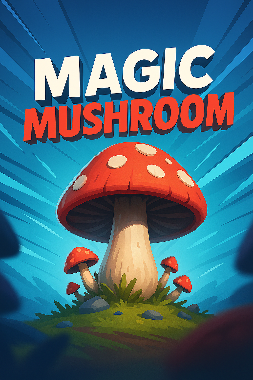 /Collection: /by davooda/Type: PNG/A colorful 3D illustration of a magic mushroom surrounded by smaller mushrooms, set against a dynamic gradient background. The title is prominently displayed in bold, engaging font.