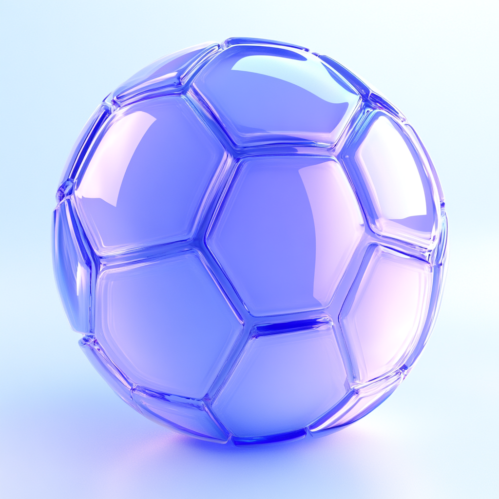 A visually striking 3D render of a soccer ball with a glossy, translucent finish and soft lighting effects, ideal for sports-themed graphics or promotional materials.