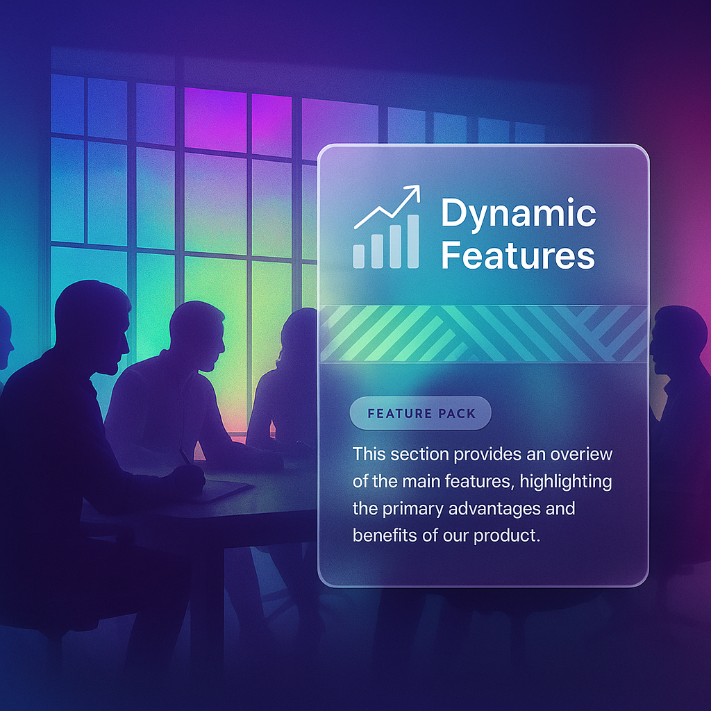/Collection: /by davooda/Type: PNG/The image depicts silhouettes of people in a meeting room, with a vibrant, multicolored window casting light. A translucent panel highlights dynamic features of a product.