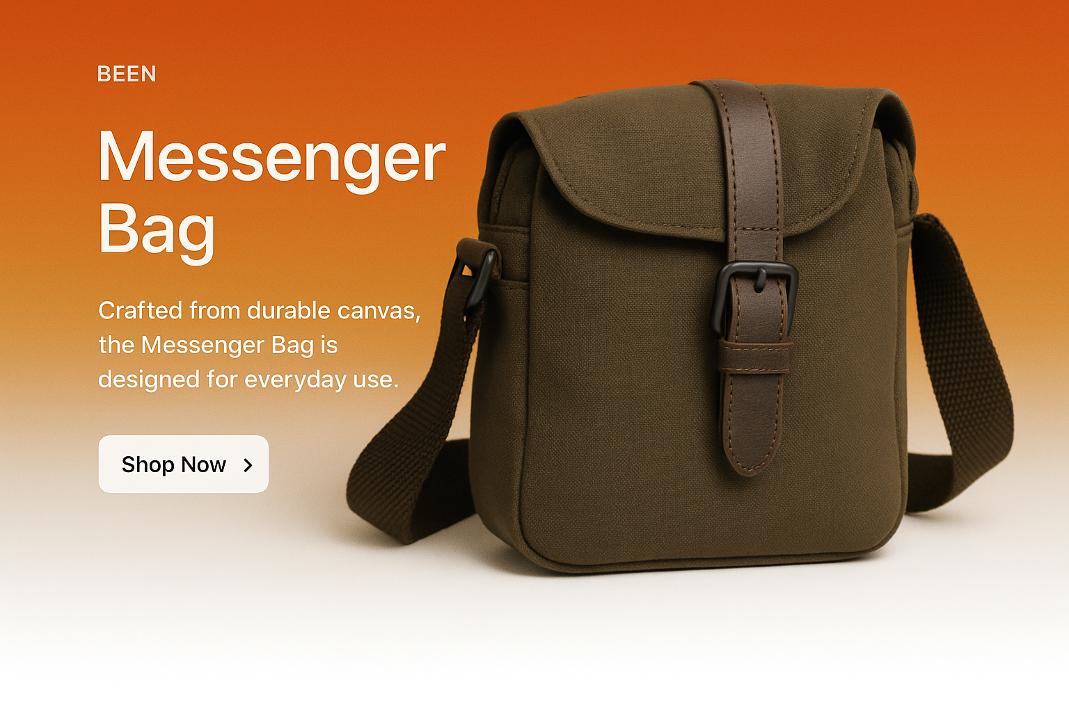 A modern web interface showcasing a messenger bag with a two-tone gradient background. Features a compact label, a brief title, and a call-to-action button.