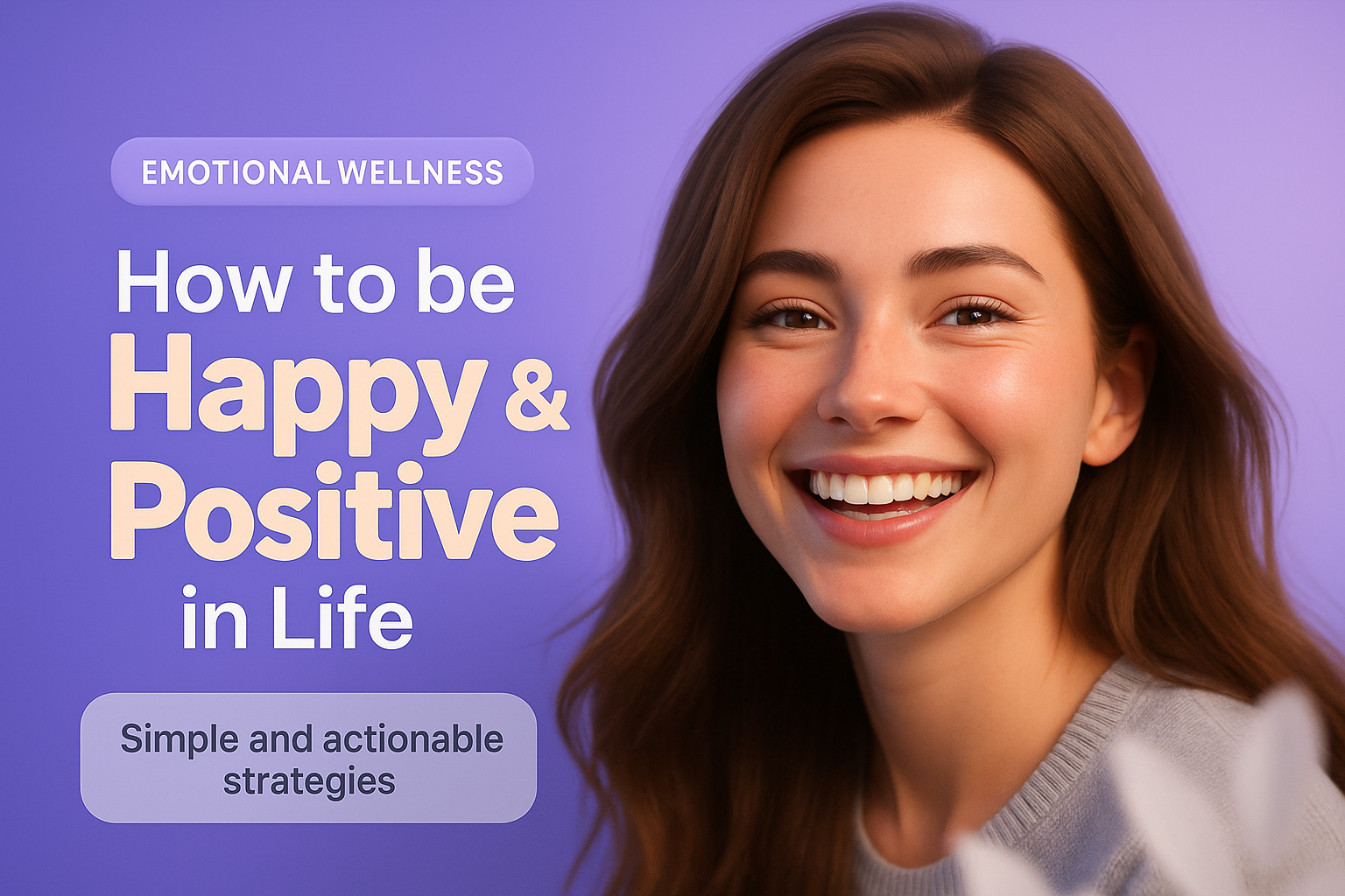 /Collection: /by davooda/Type: PNG/A beautiful young woman smiles warmly at the camera against a soft gradient background, promoting positivity and happiness with actionable strategies. The design emphasizes emotional wellness.