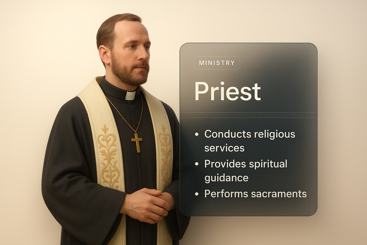 /Collection: /by davooda/Type: PNG/A modern 3D depiction of a priest standing beside a translucent block containing text about his role. The background features a smooth gradient, enhancing clarity and focus on the subject.