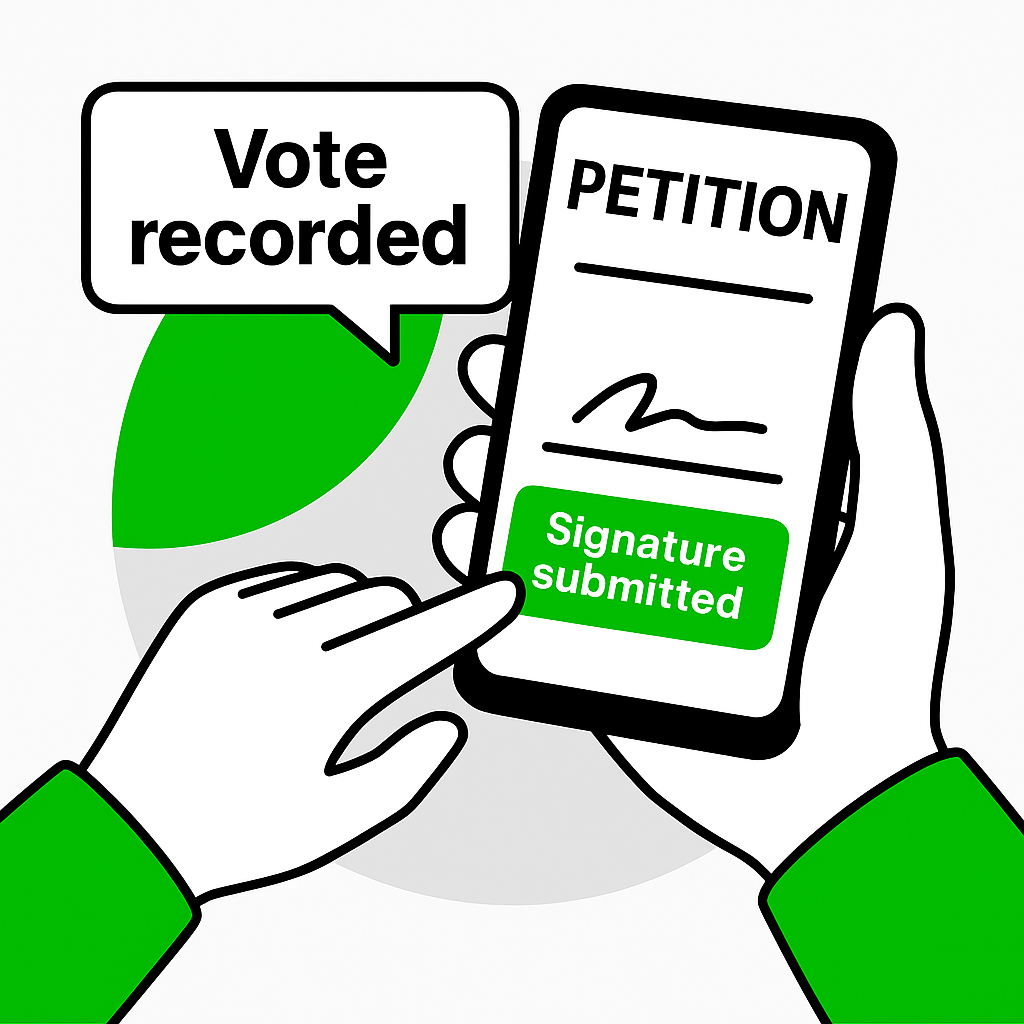 /Collection: /by davooda/Type: PNG/Illustration depicting a hand interacting with a mobile device showcasing a petition signature submission, ideal for civic engagement campaigns and digital voting promotions.