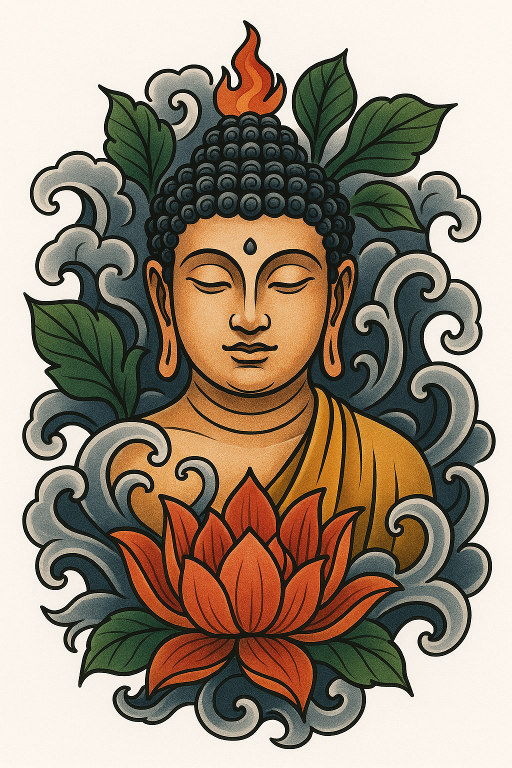 Stylized Buddha Illustration Surrounded by Lotus and Leaves