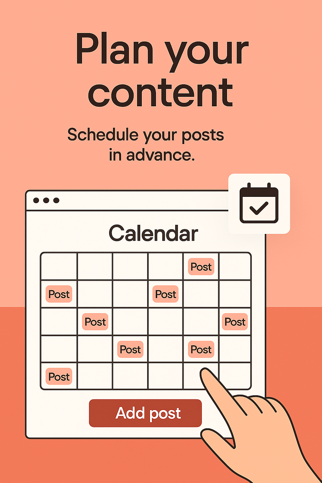 Illustrative graphic showcasing a content calendar layout for social media planning. The design features a minimalist style with a hand pointing at a calendar, ideal for marketing and social media management.