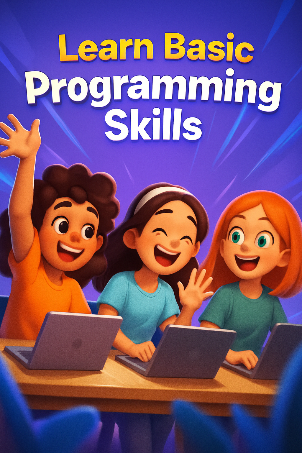/Collection: /by davooda/Type: PNG/Three happy young girls are enthusiastically participating in a coding class, learning basic programming skills while using laptops. The vibrant background adds to the energetic atmosphere.