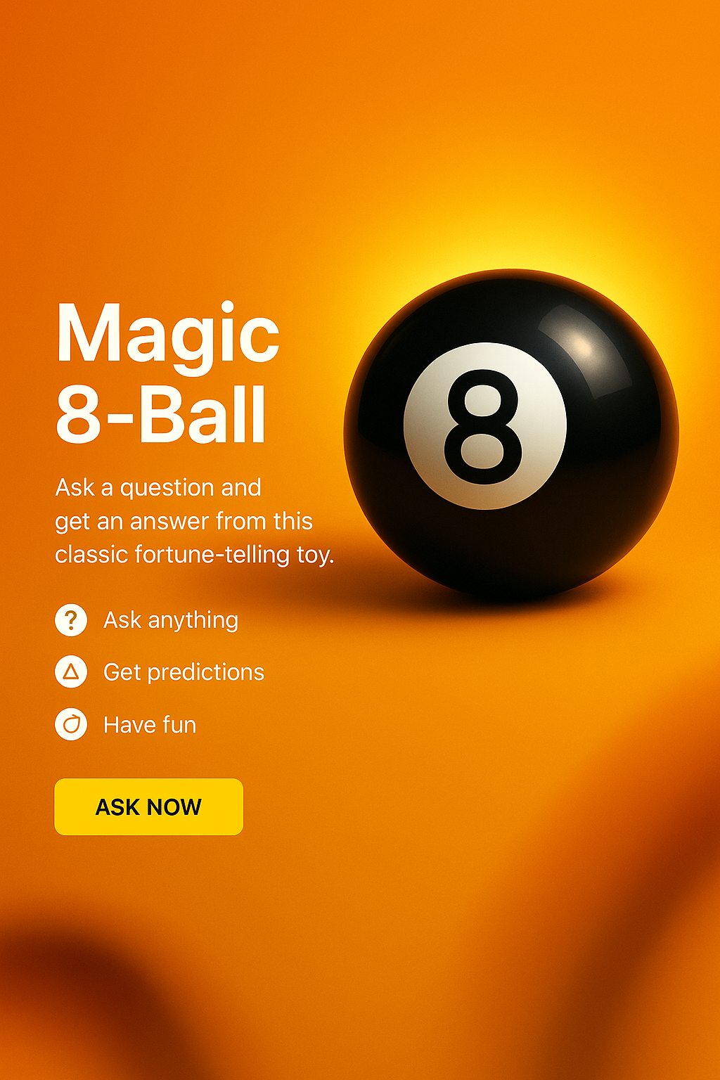 A vibrant promotional image of a Magic 8-Ball on an orange background, ideal for social media or web use, inviting users to engage with the toy.