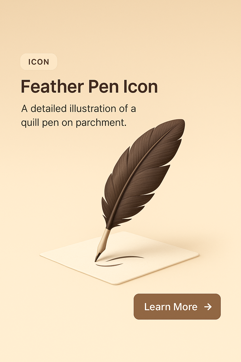 /Collection: /by davooda/Type: PNG/A 3D illustration of a feather pen on parchment, featuring a smooth gradient background. Includes a small label, short headline, descriptive text block, and an action button.